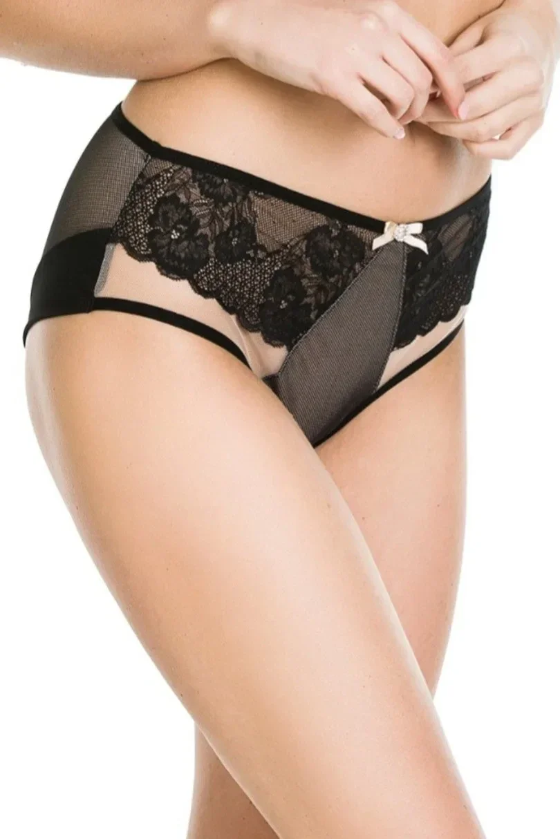 Přední díl kalhotek je ozdobený krajkou. Boky a zadní díl modelu jsou ušité z tylu. Na hýždích je ploché lemování.