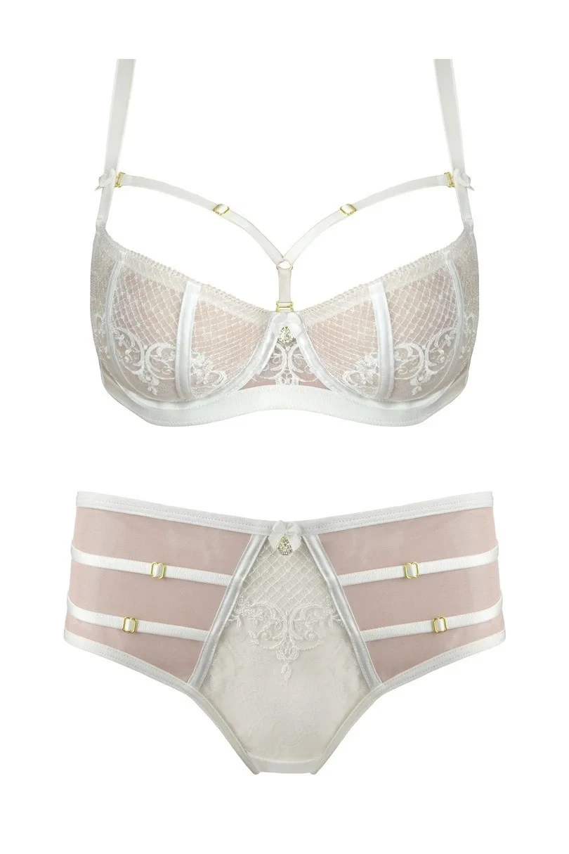 Střed z plisované látky zakončené výšivkou, boky z béžové síťoviny, kterou zdobí dva pruhy v krémové barvě. zadní díl z béžové síťoviny, spodní díl z podmořského krémového tylu, bavlněný klínek.