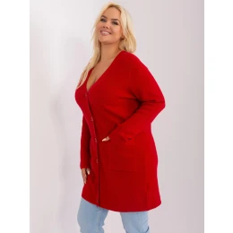 Červený plus size svetr s kapsami.