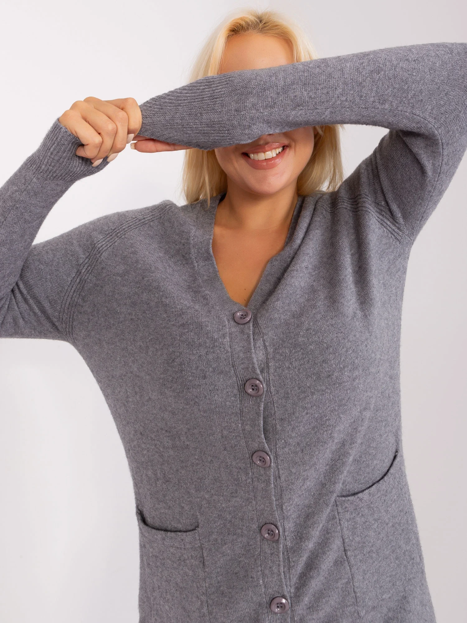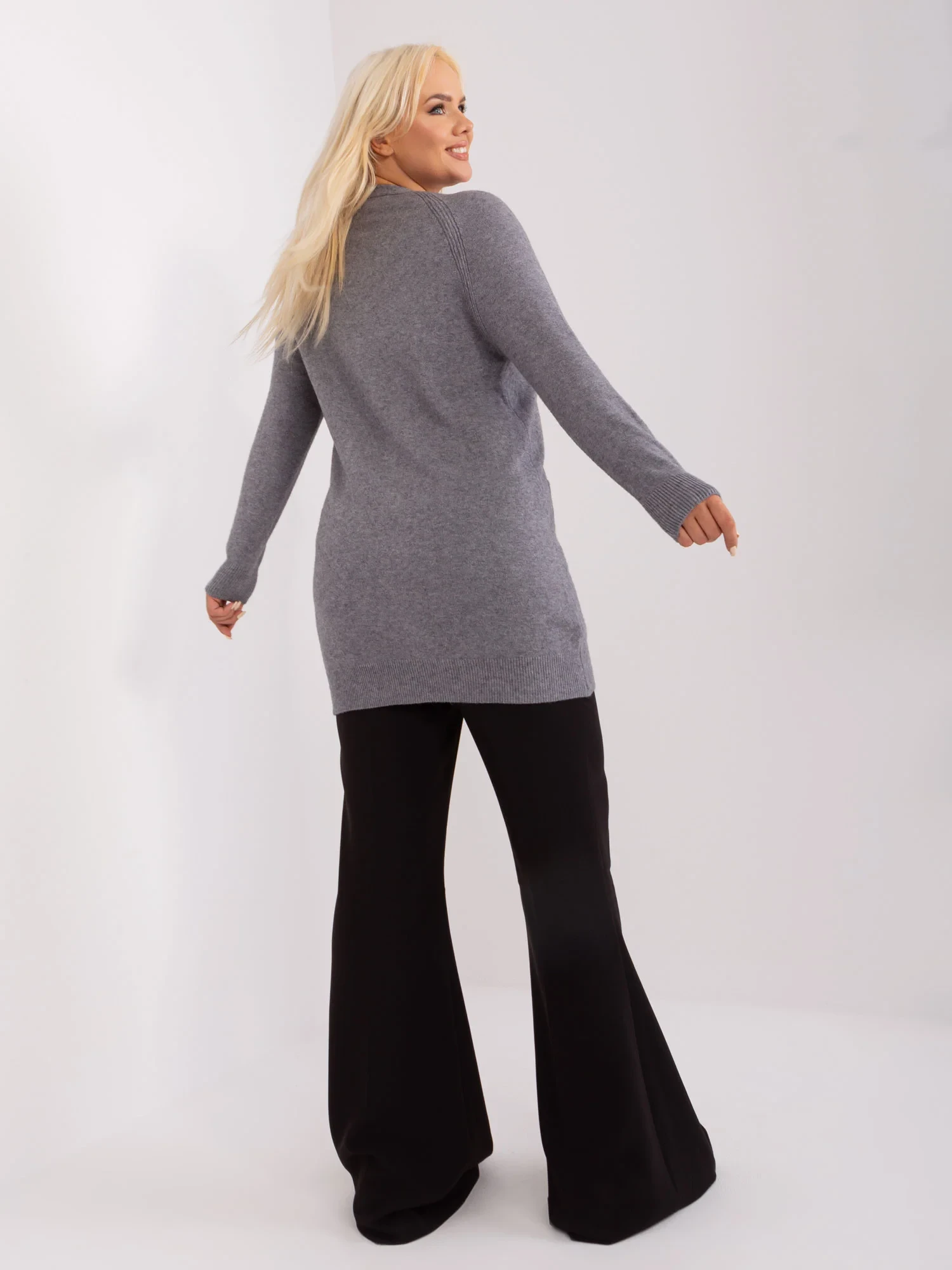Tmavě šedý dámský plus size svetr s kapsami .