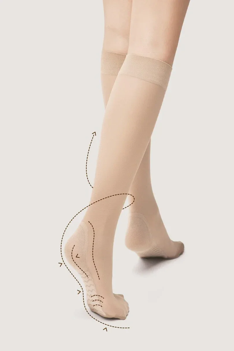 Podkolenky s profilaktickým efektem masáže chodidel a s lemem, který při nošení netlačí.
