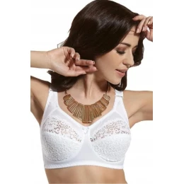 Biustonosz 584 to elegancka propozycja dla kobiet z pełnym, większym biustem, które cenią wygodę i estetykę. Model został wykonany z lekkiej siateczki, podszytej do połowy tkaniną, co zapewnia subtelny efekt prześwitu oraz odpowiednie wsparcie. Górna linia miseczek zdobiona jest kwiatowym haftem, który dodaje całości lekkości i kobiecego uroku. Satynowa kokardka i ozdobny element biżuteryjny między miseczkami podkreślają elegancki charakter modelu. Szerokie ramiączka oraz miękka konstrukcja sprawiają, że biustonosz jest niezwykle komfortowy w noszeniu przez cały dzień.