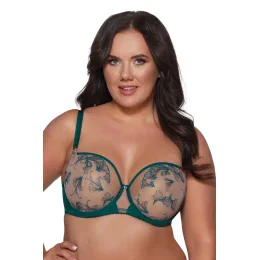 Podprsenka s měkkými košíčky, které jsou pokryté složitou výšivkou s třpytivou nití. Průhledné okénko z tylu, které tvoří můstek mezi safírovými obroučkami, model odlehčuje a dodává mu na půvabu. Obwód ze szmaragdowej dzianiny