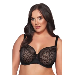 Półusztywniany biustonosz typu semi-soft, który skutecznie unosi i modeluje piersi, nadając im piękny, kulisty kształt. Dolna część miseczek została wyścielona miękką, beżową pianką, zapewniającą delikatne wsparcie, a całość pokryto czarnym elastycznym tiulem o oryginalnym, geometrycznym wzorze. Sprężyste górne partie misek idealnie dopasowują się do naturalnej linii biustu, a elegancka lamówka subtelnie zamyka je w stylowej ramie. Konstrukcja K-1416 zapewnia idealne podtrzymanie, a nieodpinane, regulowane ramiączka z metalowym, antyalergicznym regulatorem dostosowują się do Twoich potrzeb. Biustonosz jest wygodnie zapinany na dwurzędową lub trzyrzędową, trójstopniową haftkę. Model nie posiada fiszbin bocznych, co zwiększa komfort użytkowania.