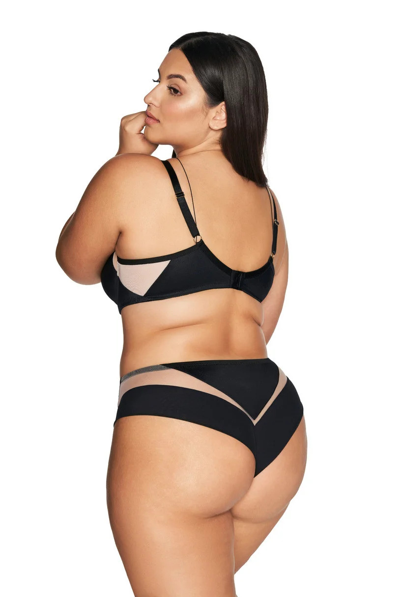 Košíčky ve tvaru braletky volně objímají oblost prsou, poskytují jim jemnou oporu a udržují je ve správné poloze. Černý úplet střední části podprsenky dokonale kontrastuje s tylem tělové barvy, který jemně odhaluje pokožku a dodává celku jemný tón.