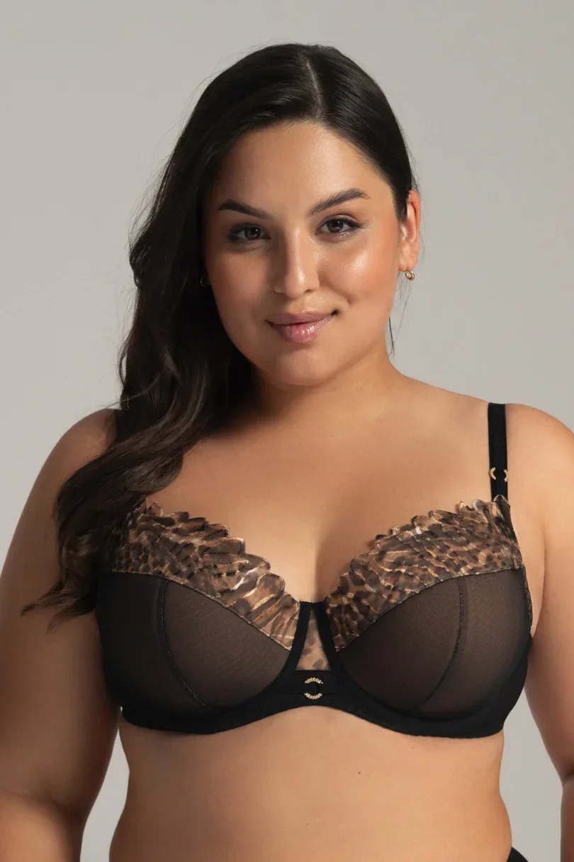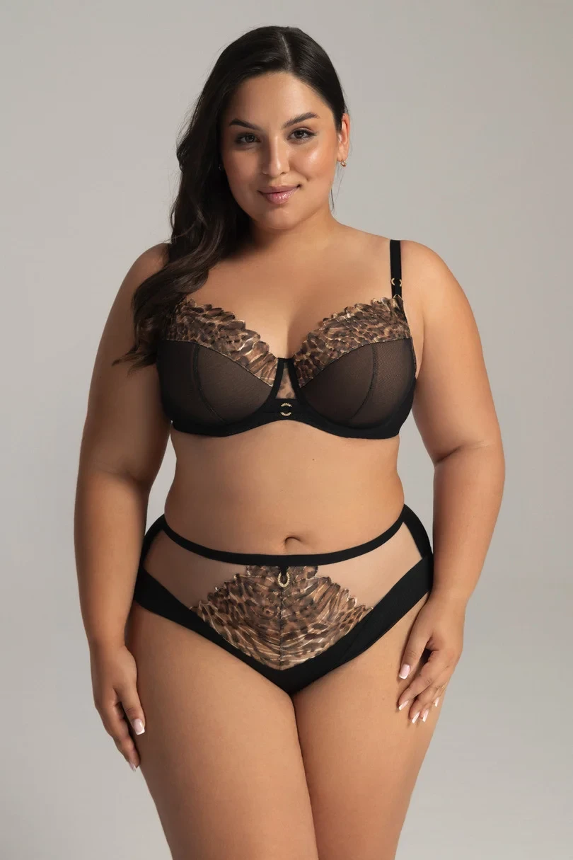 Temperamentna Liana sensualnie otula ciało. Półusztywniane miseczki AV 2143, oparte na beżowej piance pokrytej czarnym tiulem, utrzymają w ryzach nawet najbardziej niesforny biust dzięki niezrównanej konstrukcji. Złocisty haft, położony na cętkowanym druku, ozdabia kuszącą krągłość uwydatnionych piersi. Zalotne okienko, podkreślone złotym kółkiem powtórzonym na ramiączkach, dodaje Lianie animuszu. Odpowiednio dopasowane ramiączka oraz szeroki obwód stabilizują biustonosz, a skrojone z delikatnych tkanin ponętne figi i brazyliany dopełniają drapieżną całość.