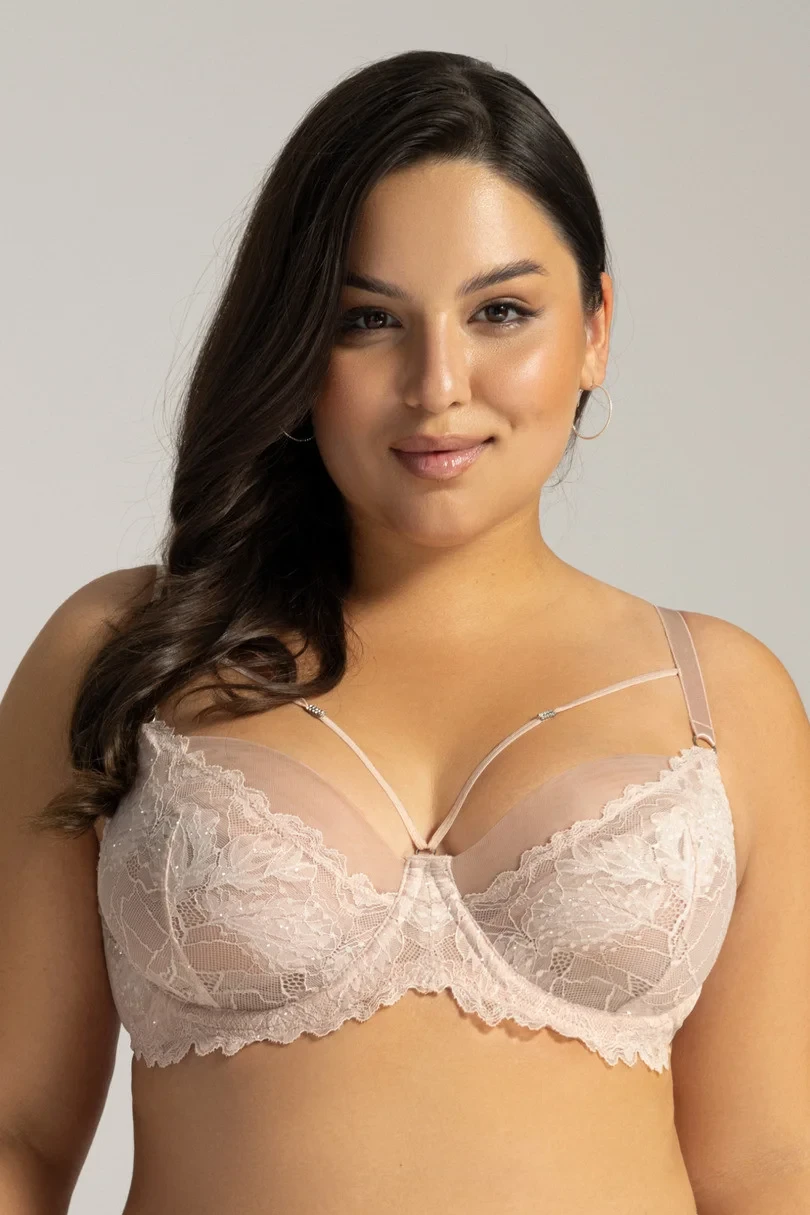 AV 2155 Fiesta Soft – urzekający biustonosz, będący prawdziwym majstersztykiem bieliźniarskim! Miękkie miseczki z markizety i tiulu zostały pokryte misterną koronką o srebrzystym blasku, która dodaje modelowi elegancji. Nietuzinkowy, delikatny odcień różu podkreśla subtelność i romantyzm biustonosza, a ozdobny bawet dodaje mu wyjątkowego wdzięku. Odpinane dekoracyjne paseczki akcentują kobiece kształty, a cyrkonie na nich umieszczone rozświetlają dekolt, przyciągając spojrzenia. Sprężyste ramiączka oraz szeroki obwód gwarantują idealne dopasowanie, podczas gdy miękkie miseczki skutecznie zbierają i podtrzymują biust. W połączeniu z brazylianami tworzy zestaw, który zachwyci każdą kobietę.