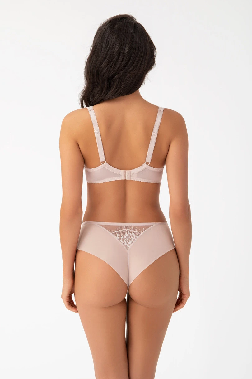 Beżowy biustonosz o klasycznym, zabudowanym kroju. Model ma miękkie, profilowane miseczki, które zapewniają naturalne ułożenie biustu i stabilne podtrzymanie. Górna część miseczek została ozdobiona delikatną koronką o kwiatowym wzorze, nadającą całości lekkości i kobiecego charakteru. Przy dekolcie oraz na mostku znajdują się subtelne, półtransparentne wstawki, które podkreślają linię biustu i dodają bieliźnie elegancji. Ramiączka są szersze i komfortowe, co sprzyja wygodzie noszenia na co dzień. Neutralne tło uwydatnia beżowy kolor oraz detale wykończenia.