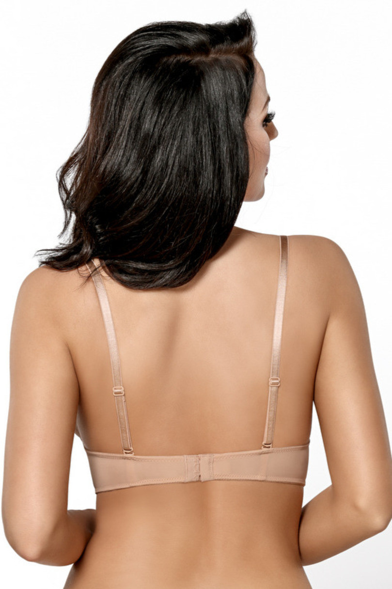 Ten beżowy biustonosz to połączenie klasycznej elegancji z nutą nowoczesnej zmysłowości. Gładkie, usztywniane miseczki w kroju push-up delikatnie unoszą biust i nadają mu pełniejszy, zaokrąglony kształt. Głęboki dekolt subtelnie podkreśla linię piersi, a neutralny odcień nude sprawia, że biustonosz świetnie stapia się ze skórą i pozostaje niewidoczny nawet pod jasnymi ubraniami.