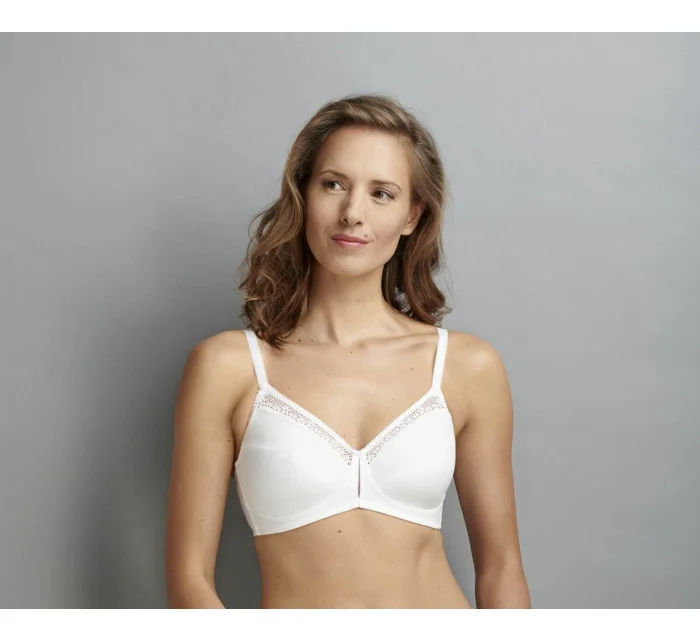Navyztužená podprsenka bez kostic z příjemného materiálu, ve výstřihu zdobené košíčky všitou jemnou krajkou.