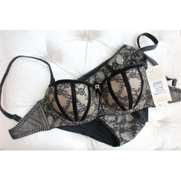 Mimořádně ženská a lákavá nabídka. Balkonová podprsenka s vertikálním střihem. Byl vyroben z krémové pleteniny pokryté exkluzivní vyšívanou černou síťovinou. Košíčky jsou zdobené sametovými stuhami, které se směrem nahoru rozšiřují, aby vaše prsa vypadala svůdně zaoblená. Vyjímatelné, jemné push-up vložky sexy zvedají poprsí. Mezi šálky půvabná mašle se zirkony. Boky vyztužené svislými velrybími kostmi. Model má ozdobná odepínací ramínka a třípolohové zapínání na dva háčky.