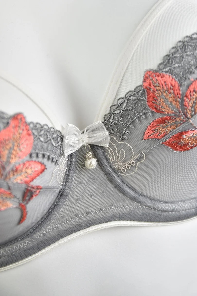 Spodní část košíčku je vyrobena ze síťoviny, horní část je vyšívaná oranžovými květy na šedém pozadí, ramínka a pásky jsou v bílé barvě. Stabilní síťovaná podprsenka poskytuje maximální oporu poprsí.