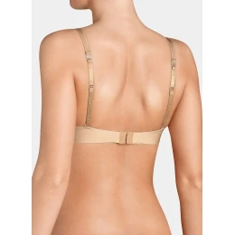 Pohodlná podprsenka s vyztuženými košíčky z měkké pěny pokryté lesklým úpletem v karamelové barvě s černým krajkovým potiskem. Nastavitelná ramínka, dvouřadé zapínání na 3 velikosti obvodu
