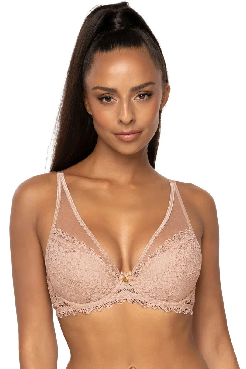 Push-up podprsenka, která je ušitá z elegantní krajky a jemné síťoviny. Má kostice, odnímatelné vložky, nastavitelná a neodnímatelná ramínka. Podprsenku zdobí bižuterní prvek, mašlička a tullem prodloužená ramínka