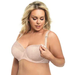 Polovyztužená podprsenka s kosticí a rychloupínacím systémem pro novopečené maminky. Vyrobena z měkkého béžového úpletu, podšitá bavlnou. Košíčky jsou zakončeny krajkou s krásným květinovým motivem. Díky rychloupínacím ramínkům umožňuje podprsenka kojení podle potřeby při zachování vysoké úrovně pohodlí pro kojící ženu. 71 % polyamid, 21 % bavlna, 8 % elastan.
