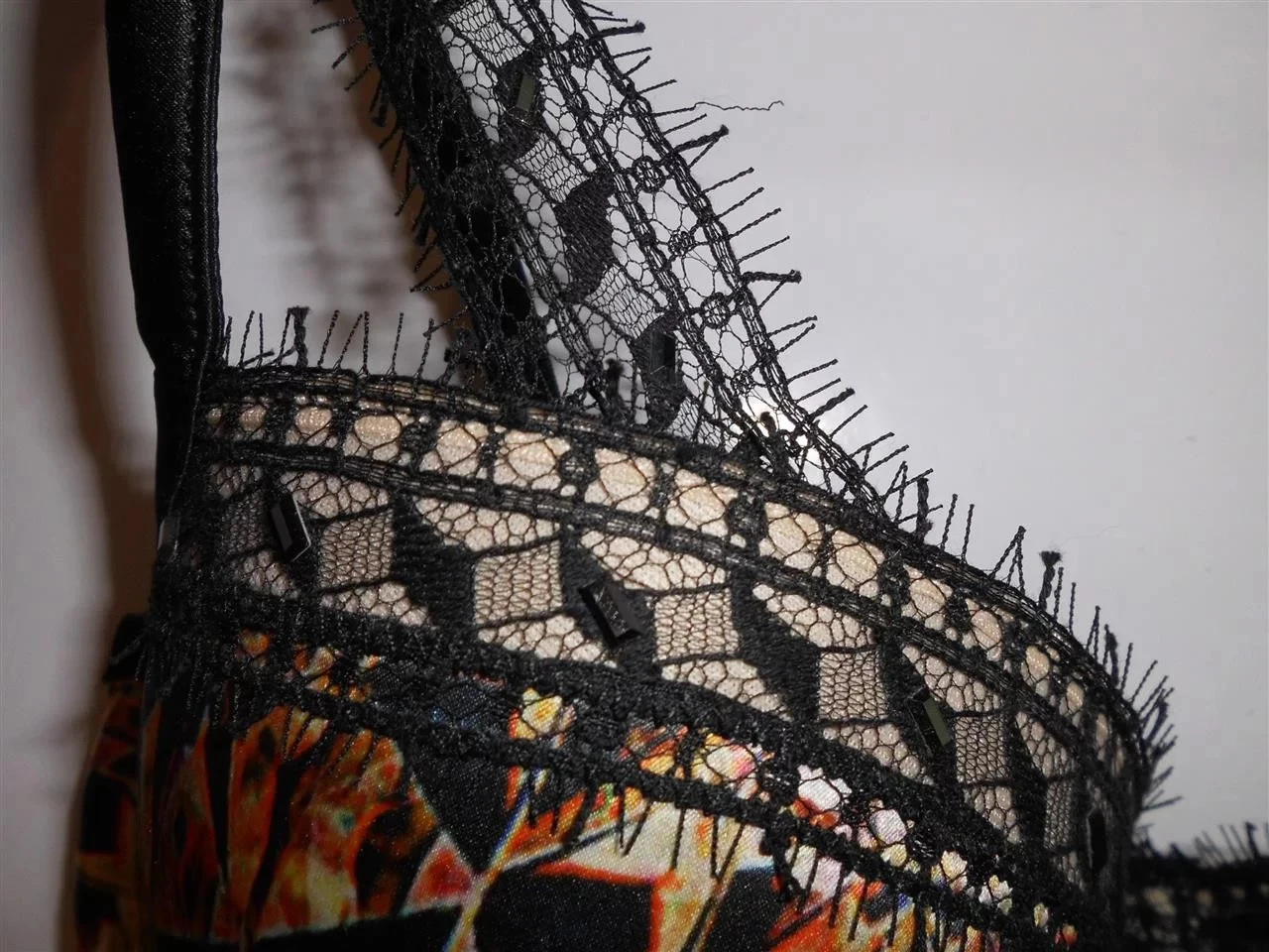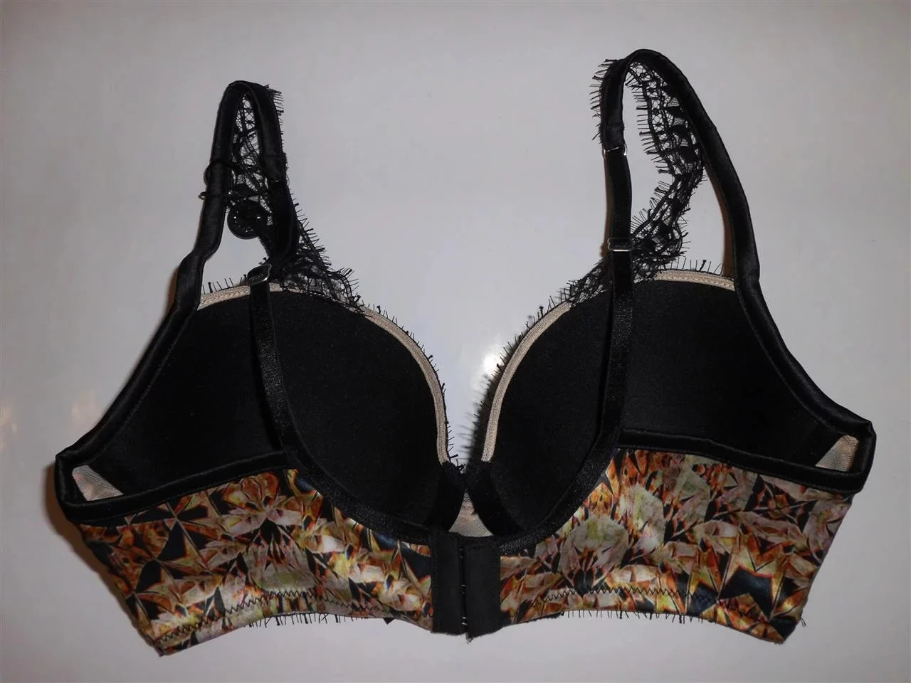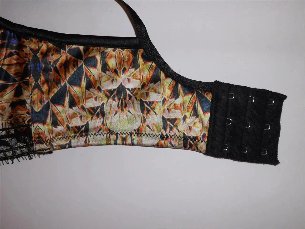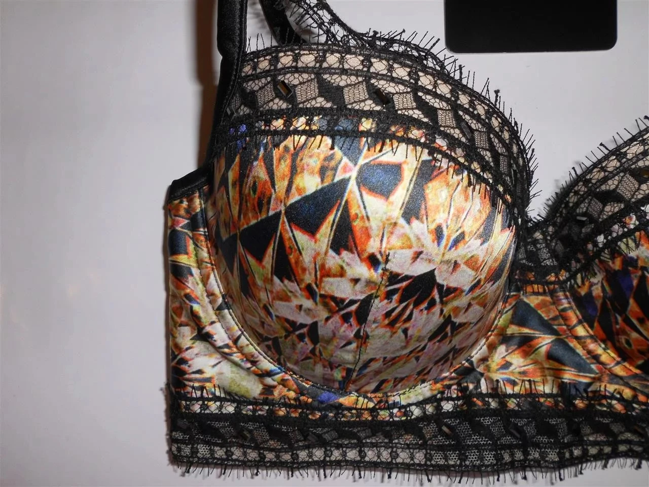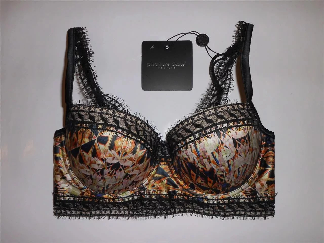 Luxusní podprsenka Pleasure State P23 - 1212C, pestrobarevný hladký materiál kombinovaný černou krajkou, zapínání na 3 háčky. Složení: 92% polyester, 8% elastan.
