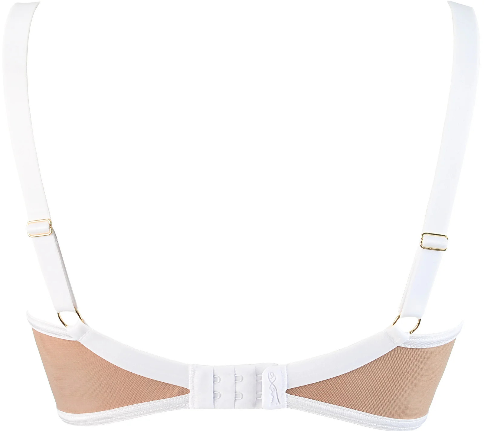 Andělská souprava spodního prádla na den i noc, díky níž se budete cítit naplněná a výjimečná, vyberte si soupravu navrženou speciálně pro ženy, které od spodního prádla očekávají víc. Košíčky jsou vyrobeny z drahé bílé výšivky, přes kterou budou vaše ňadra jemně prosvítat a svádět každé oko. Zadní díl tohoto modelu je béžový a tylový a splývá s pokožkou, takže vytváří průhledný efekt. Tato měkká podprsenka s kosticemi pod košíčky a bočními velrybími kosticemi se zapíná na dvojitý háček se zlatými detaily.