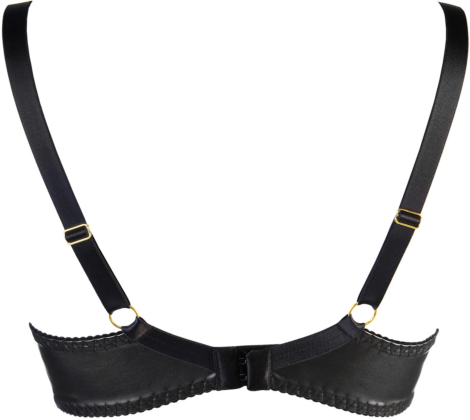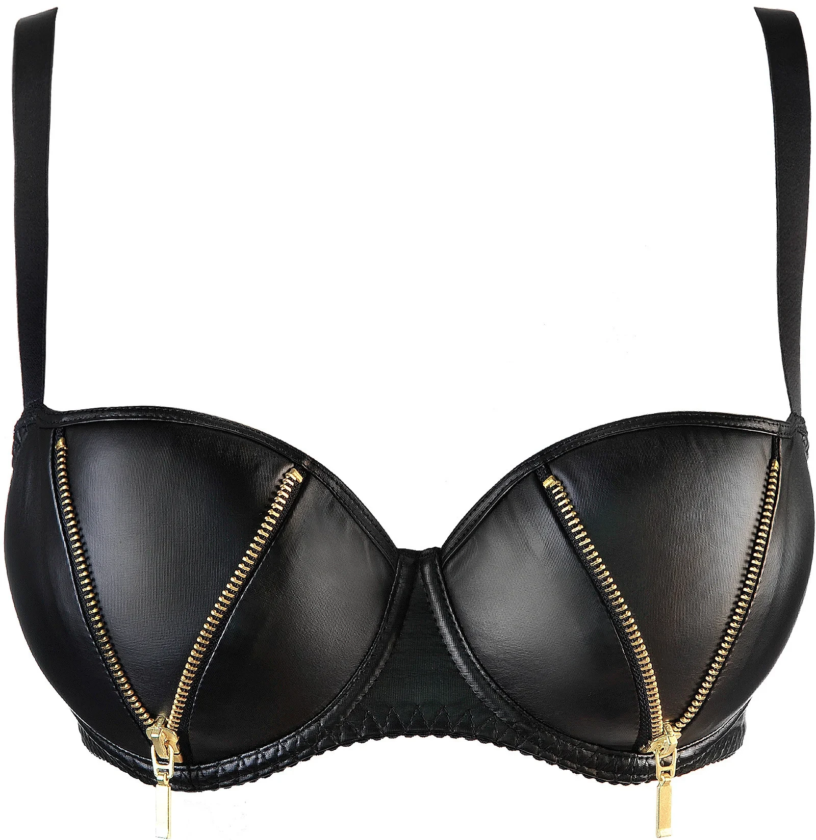 Latexová podprsenka se zlatými ozdobnými zipy je jistě dvouúčelovým modelem, na jedné straně ji můžete nosit každý den jako nevšední soupravu spodního prádla a na druhé straně ji lze využít pro speciální úkoly, skvěle se hodí na společné večery a párty. Model má vnitřní vycpávky, navíc zajištěné drátky pod košíčkem pro stabilitu a zabránění posunu podprsenky. Má nastavitelná, neodnímatelná ramínka a dvouřadé nebo třířadé zdobení háčky a očky ve zlaté barvě.