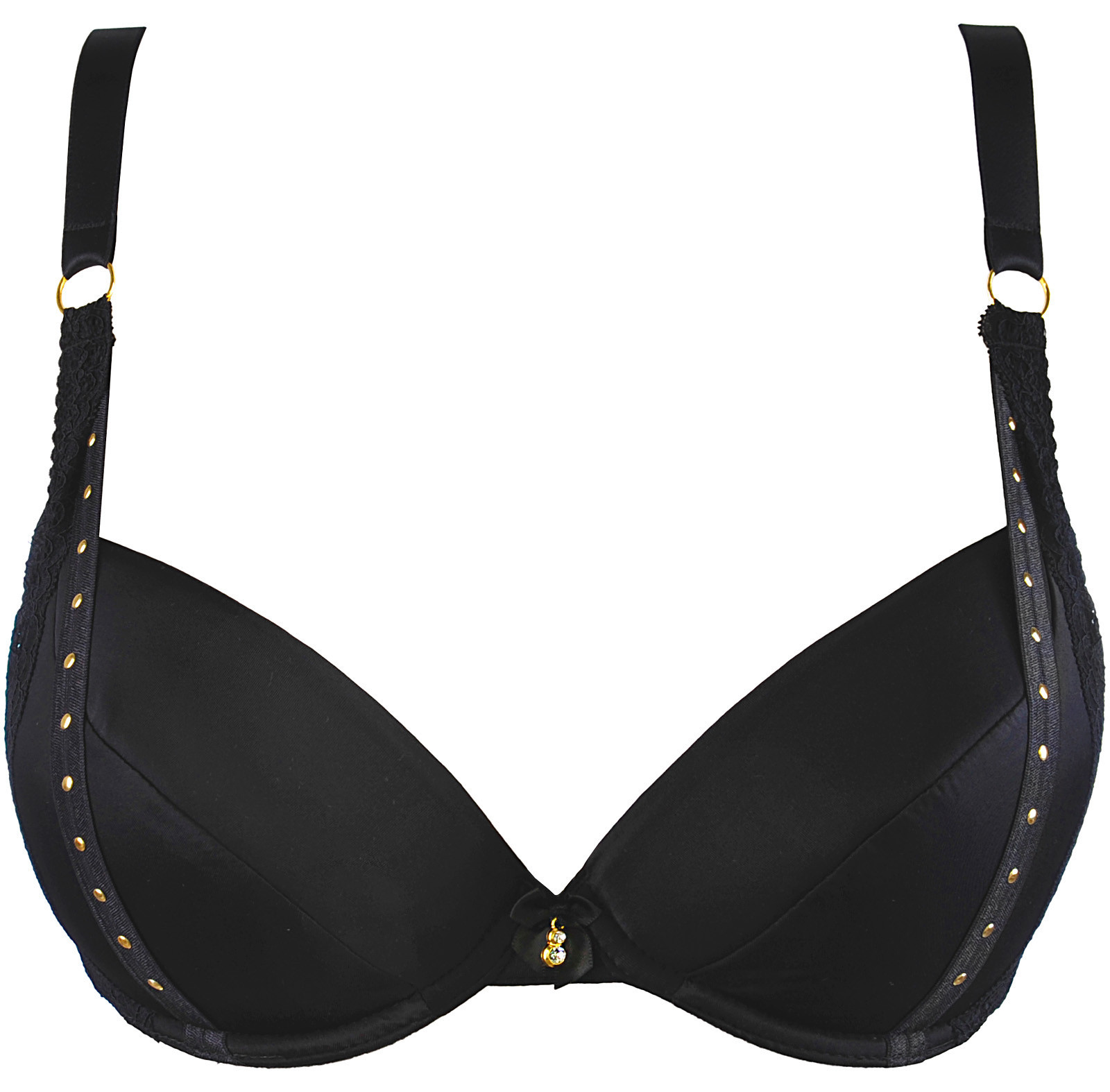 Push-up podprsenka v klasické černé barvě je návrhem pro ženy, které ocení eleganci s nádechem smyslnosti. Je vyrobena z hladkého, jemně lesklého materiálu, krásně zvýrazňuje poprsí a zajišťuje efektivní pozvednutí a modelaci. Boky podprsenky zdobí stylová stuha se zlatými cvočky a jemná krajka, které celku dodávají rafinovaný charakter. Nastavitelná, neodnímatelná ramínka zajišťují pohodlí při používání a mezi košíčky upoutá pozornost drobná bižuterní ozdoba. Podprsenka se skvěle doplňuje s podvazkovým pásem V-9782 a tangy V-9788, čímž vytváří svůdný a zároveň elegantní komplet.