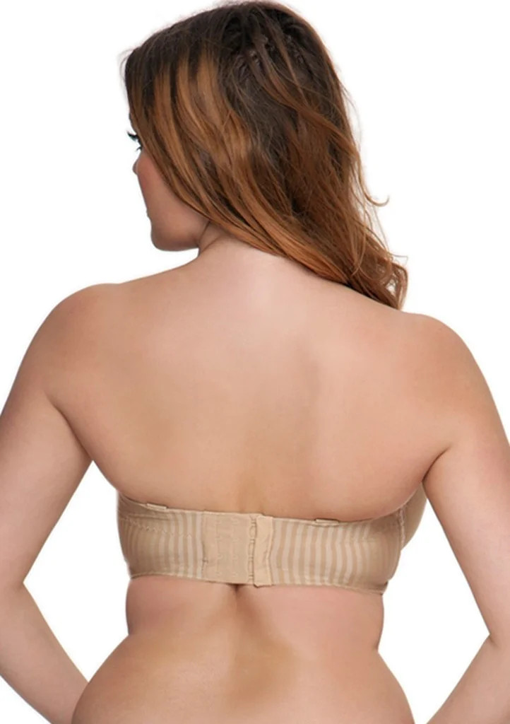 Dámská elegantní podprsenka Luxe značky Curvy Kate. Tato podprsenka v módní pudrové barvě je dokonale střižená pro větší poprsí. Košíčky jsou střiženy tak, aby udržely Vaše poprsí a vytvarovaly Vám krásný dekolt. I při větších velikostech tato podprsenka vypadá luxusně. Košíčky jsou hladké a mezi nimi je aplikace saténové mašličky s dvěma drobnými knoflíčky. Uvnitř košíčků jsou na bocích výztuže z tylu. Ramínka jsou nastavitelná, která lze úplně oddělat a využít tento model podprsenky pod korzetové topy nebo variabilně upnout na zádech křížením nebo klasickým zapínáním. Krásný, drobně proužkovaný elastický obvod je široký, dvojitě šitý a je zpevněn na bocích pružnými kosticemi. Na vnitřní straně po celé délce obvodu jsou silikonové proužky, které Vám zaručí pevné držení na těle, abyste se cítila sebejistě. Zadní zapínání je na tři pozice a čtyři háčky.