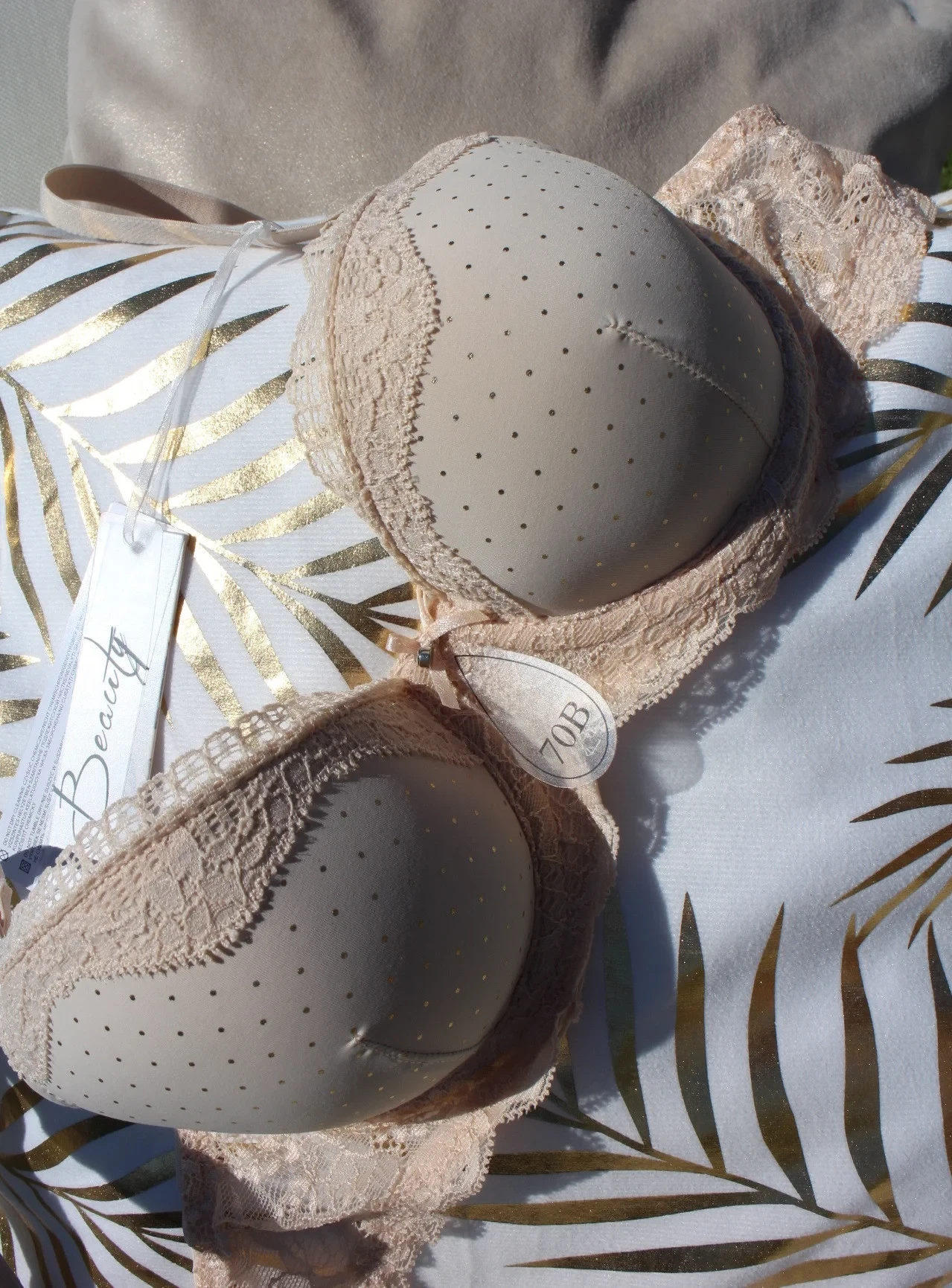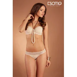 Půvabná podprsenka s push-up efektem, která dokonale pozvedne a zvětší prsa a vytvoří sexy dekolt. Košíčky jsou vyrobeny z jemné látky v béžovém odstínu, pokryté sladkým zlatým hráškem. Horní linie modelu je zvýrazněna jemnou krajkou. Podprsenka má kostice a push-up výplň, kterou lze v případě potřeby vyjmout. Krajkové boky, které dodávají lehkost. Uprostřed šálků je umístěn zirkonový přívěsek. Odnímatelné ramenní popruhy. Značku Esotiq doporučuje Joanna Krupa.