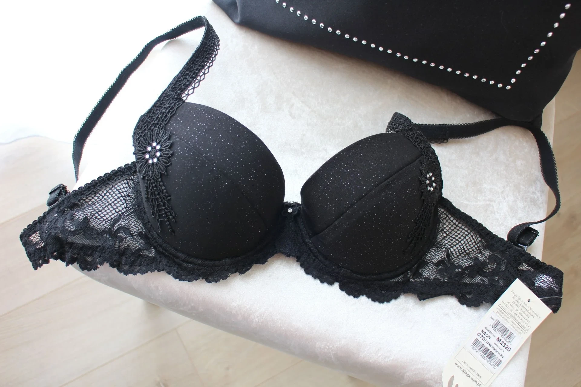 Mimořádně efektní podprsenka s push-up efektem, která prsa nejen tvaruje, ale také je pozvedá a zvětšuje! Košíčky jsou podšité hladkou černou látkou, která je však efektně zdobená třpytivými stříbrnými glitry. Na bocích je půvabná květinová krajka s elegantními zirkony. Ramínka nejsou odepínací, model má vyjímatelné push-up vycpávky. Kvintesence ženskosti!