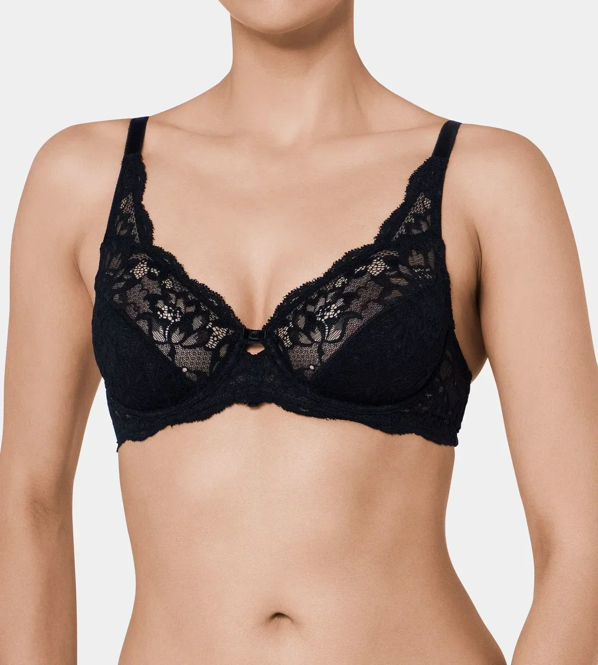 Širší krajková ramínka vepředu nabízejí dokonalou oporu a přizpůsobení až pro plnější košíčky