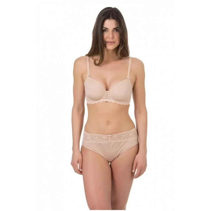 Dámská nevyztužená podprsenka, s kosticemi. Košíčky podšité. U kostic luxusní krajka, která pokračuje až na záda k zapínání. Posouvací ramínka.