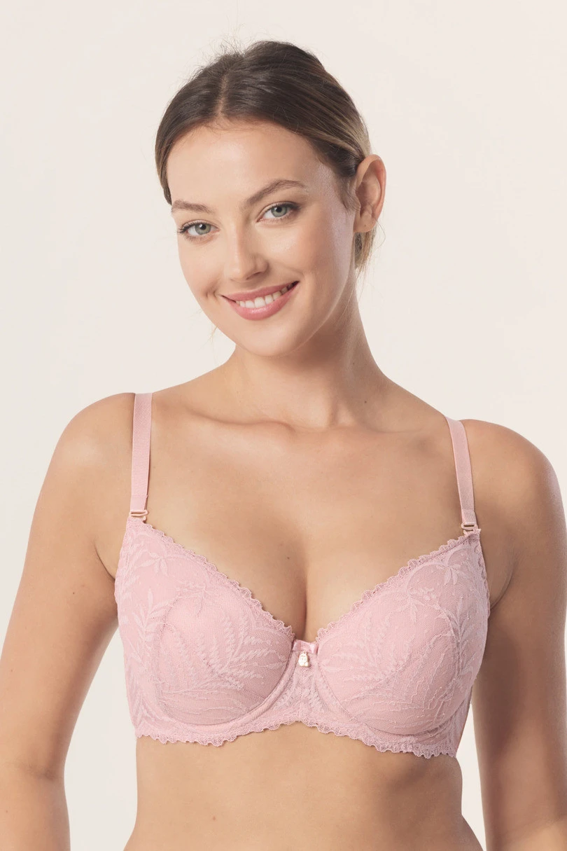 Biustonosz push-up Petra BP16 to wyjątkowo kobiecy model, który łączy elegancki design z funkcjonalną konstrukcją modelującą. Wykonany z subtelnej, różowej koronki, zachwyca delikatnym wzorem i starannym wykończeniem, podkreślając naturalne piękno sylwetki. Miseczki od wewnętrznej strony zostały podszyte miękką bawełną, co zapewnia komfort noszenia przez cały dzień oraz przyjemne uczucie dla skóry. Wyjmowane wkładki push-up umożliwiają regulację stopnia uniesienia i modelowania biustu – możesz dopasować efekt do swoich potrzeb i stylizacji. Konstrukcja BP16 została zaprojektowana tak, aby skutecznie zbierać i uwydatniać piersi, tworząc pełniejszy, zaokrąglony dekolt. Boki wzmocnione pionową fiszbiną stabilizują obwód i poprawiają podtrzymanie. Odpinane, regulowane ramiączka pozwalają na różne sposoby noszenia – również pod kreacje z odkrytymi ramionami. Dzięki połączeniu poliamidu, bawełny i elastanu (63% poliamid, 24% bawełna, 13% elastan) biustonosz jes