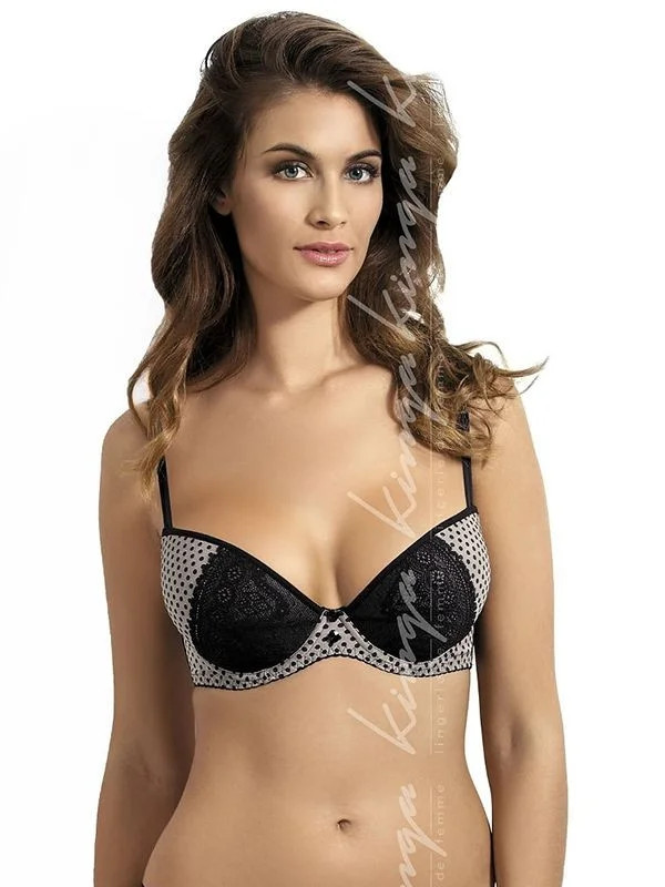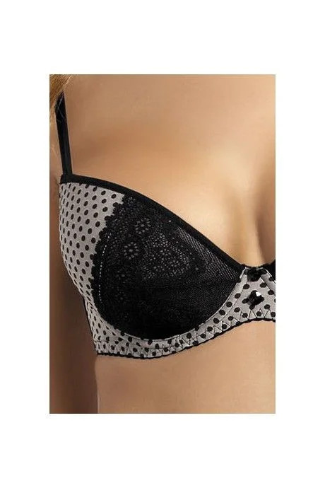 Fenomenální podprsenka v tmavé barvě. Hluboké košíčky s kosticemi, vhodné k šatům a halenkám s mírně hlubším výstřihem, s kosticemi a push-up efektem - smyslně pozvedne a zvětší poprsí. Velmi ženský design: drobné černé hrášky a krajka. Italská tkanina působí elegantně. Složení: polyester 64 %, elastan 18 %, polyamid 15 %, bavlna 3 %.