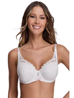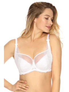 Podprsenka s kosticí z lehkého tattoo-materiálu v kombinaci s elastickým tylem a ušlechtilou švýcarskou výšivkou. Vysoký komfort při nošení u velkých velikostí košíčků i obvodů zaručují promyšlené detaily, jako jsou vypodložené kosticové tunýlky a ramínka opatřená flaušovými vlákny. Střih zadního dílu se směrem do středu zužuje a ramínka jsou pro dosažení lepšího držení poprsí posazena více na střed.