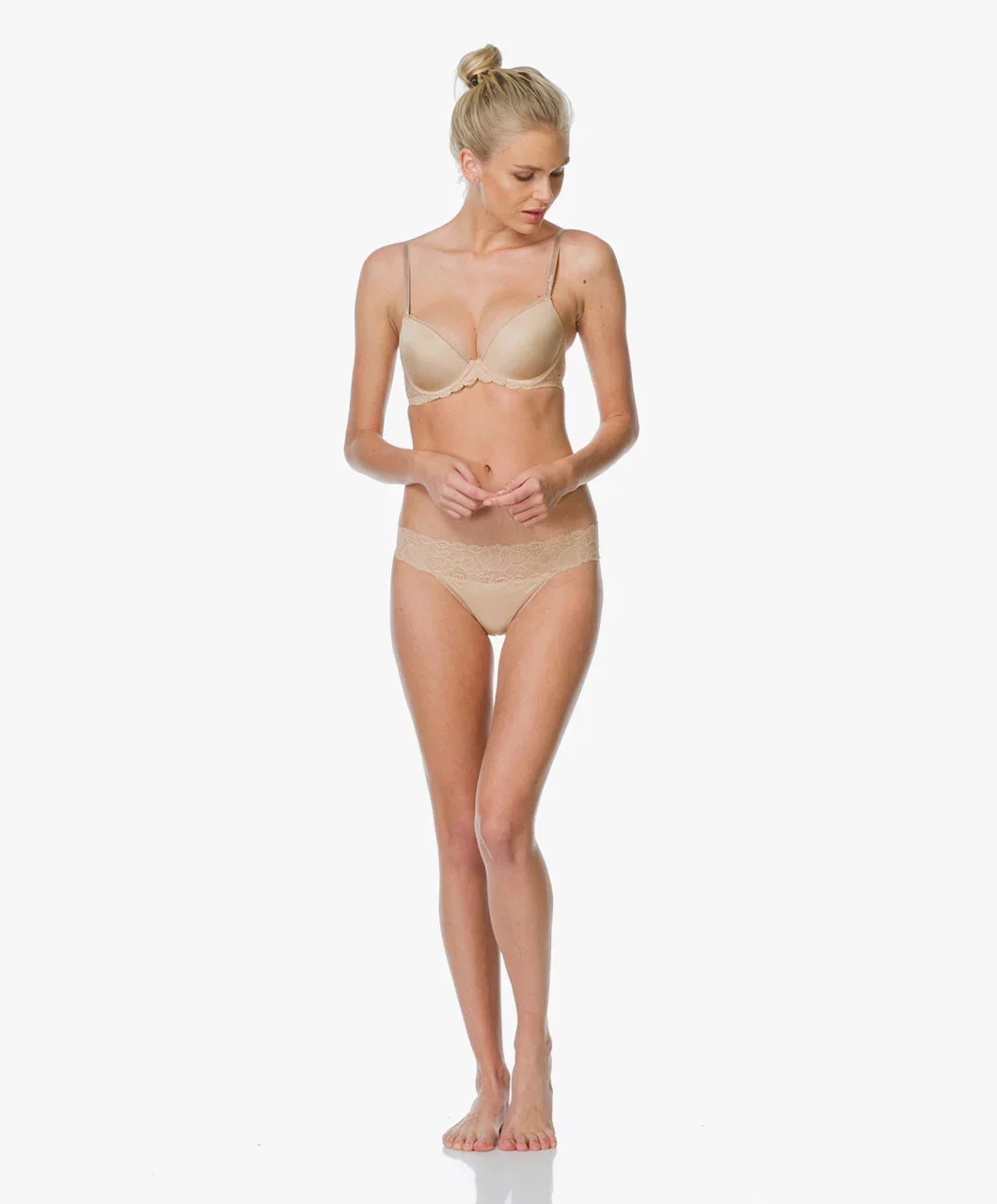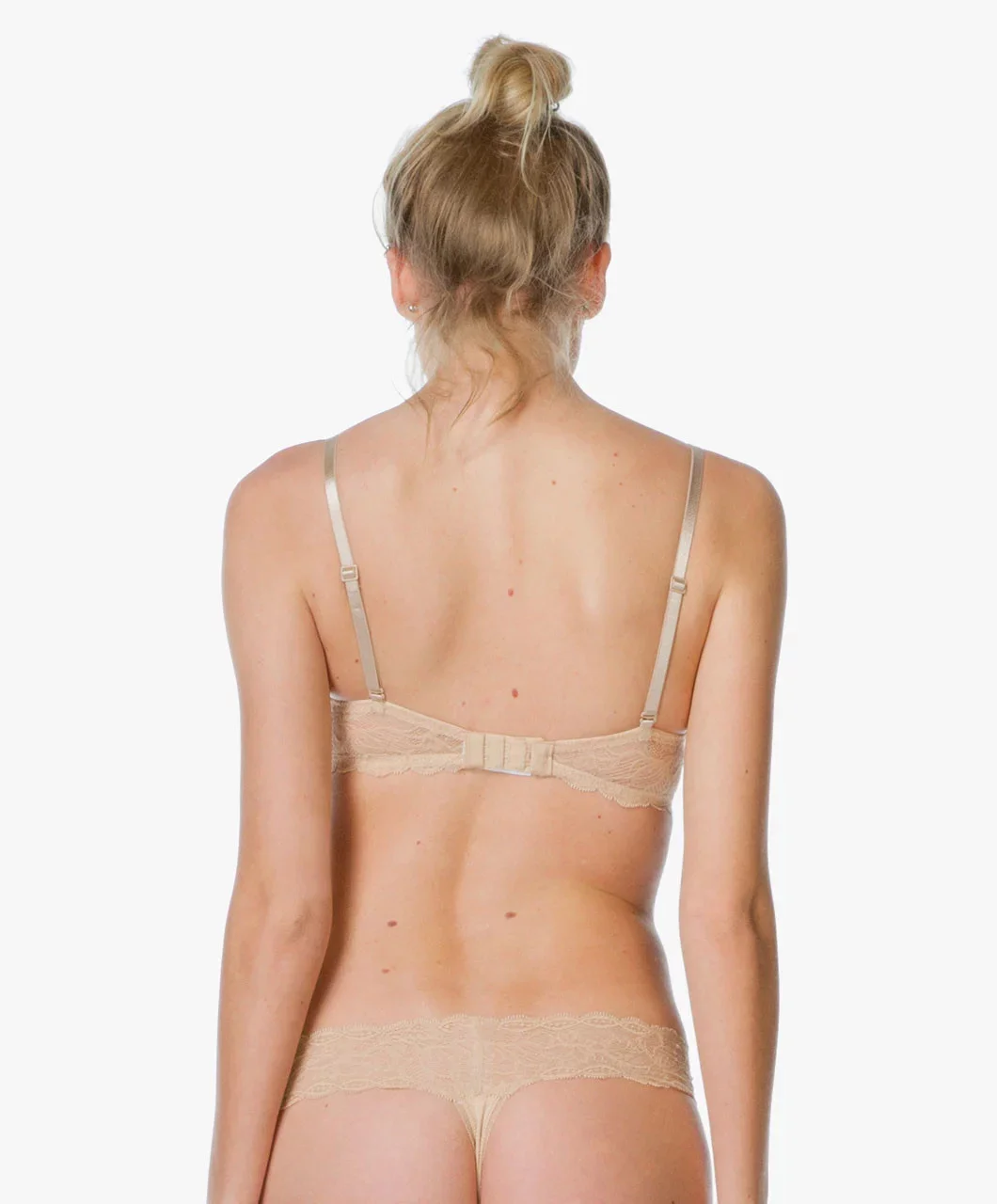 Podprsenka s hladkými košíčky push-up, okraje košíčků zdobené. Obvod podprsenky krajkový.