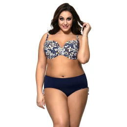 Białe kwiaty magnolii i stokrotki na granatowym tle tkaniny, z której wykonany jest SK 114 przywodzą na myśl beztroski czas wakacji. Usztywniany biustonosz typu full cup doskonale podtrzymuje biust i uwydatnia kuszące krągłości. Do kompletu przygotowano gładkie granatowe figi z ozdobnymi kolorowymi troczkami po bokach.