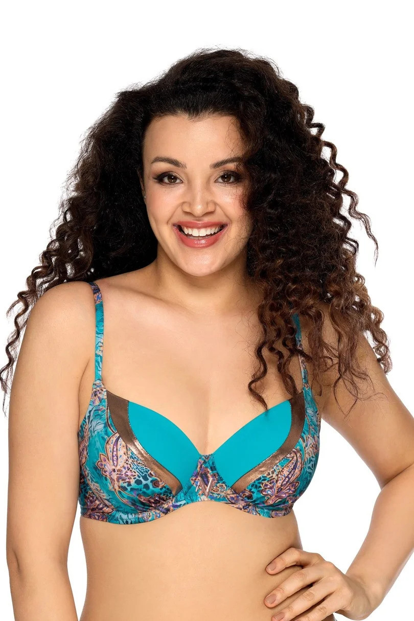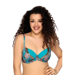 Porządnej dawki egzotyki właściwej letnim stylizacjom dostarczy model SK 141. Dzięki pełnym usztywnianym miseczkom, elastycznemu obwodowi i odpowiednio dopasowanym ramiączkom biustonosz zbierze, uniesie i podtrzyma piersi, czyniąc dekolt wyjątkowo ponętnym. Dzianina bogato pokryta zwierzęco-roślinnym printem idealnie współgra z metalicznymi wstawkami i turkusowym wykończeniem, a nowy logotyp AVA perfekcyjnie wpasowuje się w rajskie tło.