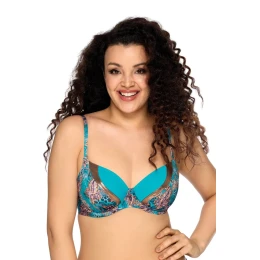 Porządnej dawki egzotyki właściwej letnim stylizacjom dostarczy model SK 141. Dzięki pełnym usztywnianym miseczkom, elastycznemu obwodowi i odpowiednio dopasowanym ramiączkom biustonosz zbierze, uniesie i podtrzyma piersi, czyniąc dekolt wyjątkowo ponętnym. Dzianina bogato pokryta zwierzęco-roślinnym printem idealnie współgra z metalicznymi wstawkami i turkusowym wykończeniem, a nowy logotyp AVA perfekcyjnie wpasowuje się w rajskie tło.
