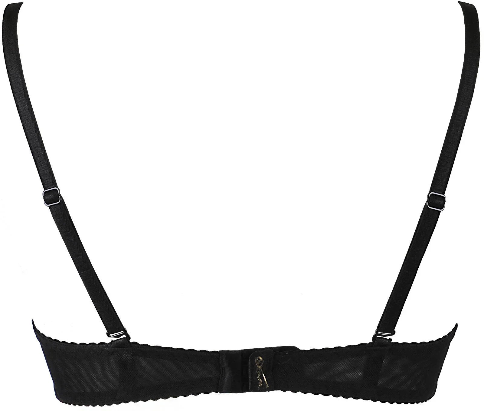 Červené ohnivé květy rozkvétají jako rafinovaná výšivka na košíčcích podprsenky peek-a-boo. Černá krajka tvoří ideální pozadí pro odvážné červené stehy, které dodají vašemu tělu pikantnost. Odvážný střih košíčků odhalí krásu vašich ňader. Odnímatelná ramínka vám umožní ještě více ukázat vaše ženské přednosti... Podprsenka má standardní třístupňové nastavení obvodu a nastavitelná ramínka.