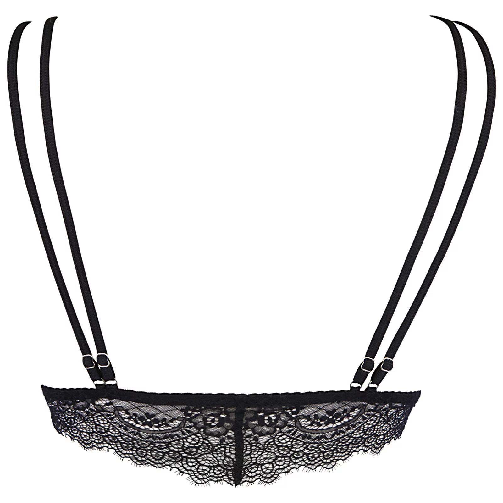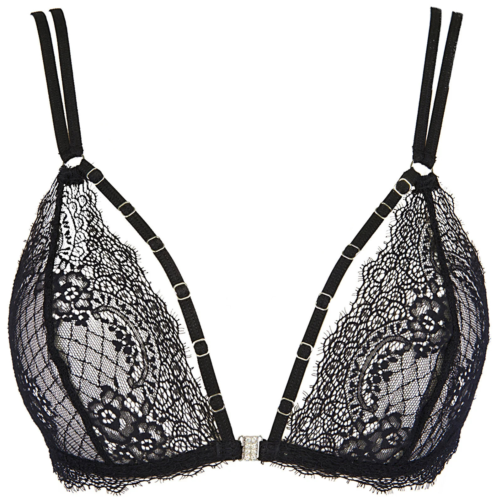 Naše nová podprsenka je výjimečně pohodlný model bez jakýchkoli pevných prvků, jako jsou kostice. To zaručuje příjemné nošení a dobrý vzhled. Je naprosto sexy a krásná, vyrobená z jemné krajky s roztřepenými konci, které celému designu dodávají charakter. Podprsenka se zapíná na přední straně díky sponě ukryté v ozdobě z kubických zirkonů a neodnímatelná, nastavitelná ramínka a prsní proužky zdobené stříbrnými prvky tvoří jedinečný, aktuální design.