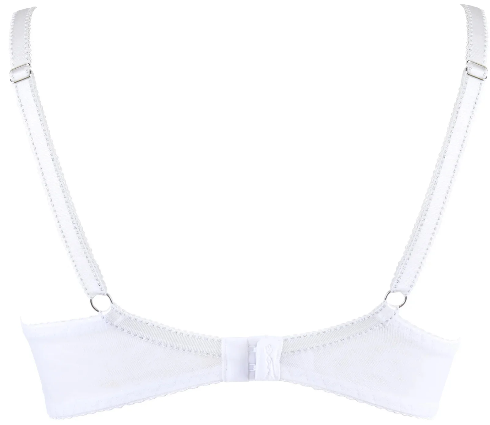 Měkká balkonetová podprsenka ve sněhově bílé barvě s trojdílnými košíčky zvýrazní a pozvedne vaše prsa v klasickém stylu, aniž by zakrývala jejich přirozenou krásu. Podprsenka je vhodná na každodenní vycházky i na neobvyklé příležitosti s pestrým oblečením. Má zdobené stříbrné nitě na ramínkách, která jsou neodnímatelná, ale nastavitelná pomocí dvojitého zapínání na háčky a očka. Centrální zirkonová ozdoba mezi košíčky.