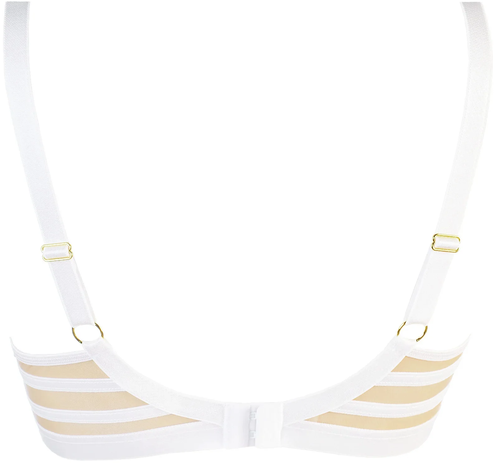 Nebesky báječný model s bílou krajkou od značky AXAMI je letní lehkostí, kterou musíte mít. Je to ideální komplet k tenkým halenkám a lehkým outfitům. Měkká podprsenka zvýrazní vaše kulatá ňadra, zatímco zadní část z průhledného tylu a bílých ramínek dodává stylingu lehkost. Na ramínkách a mezi prsy je zdobená zlatými ozdobami. Podprsenka poskytuje košíčkům oporu a nastavitelná ramínka jsou neodepínací. Materiálové složení: polyester 58 %, polyamid 40 %, elastan 2 %