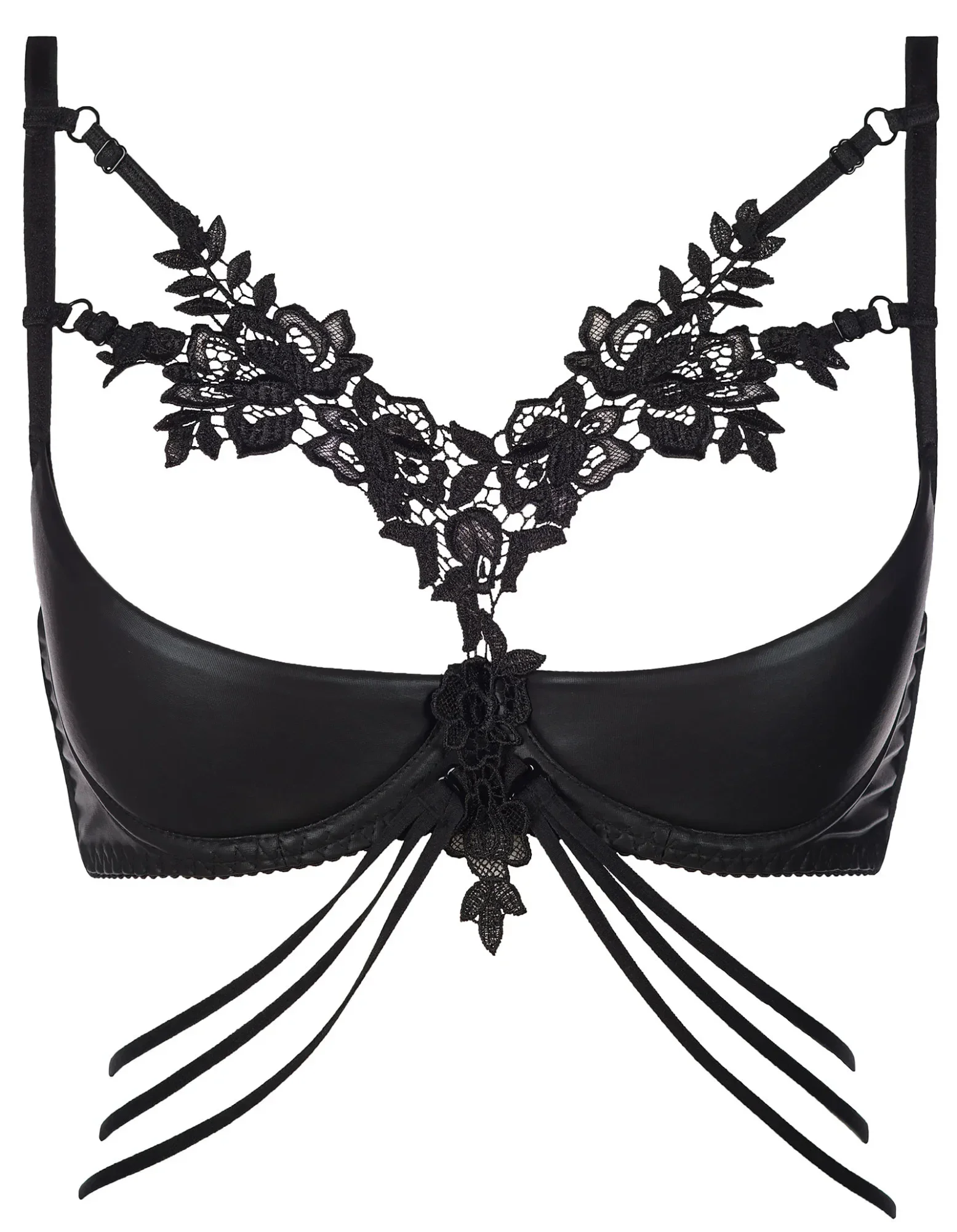 | Rozkošná, svůdná, černá podprsenka peek-a-boo V-8331 vám může zamotat hlavu svou strukturou a střihem - jemná matná tkanina vypadá jako latex. Krásnákvětinová výšivka na dekoltu není odnímatelná. Podprsenka má standardní háčky. |