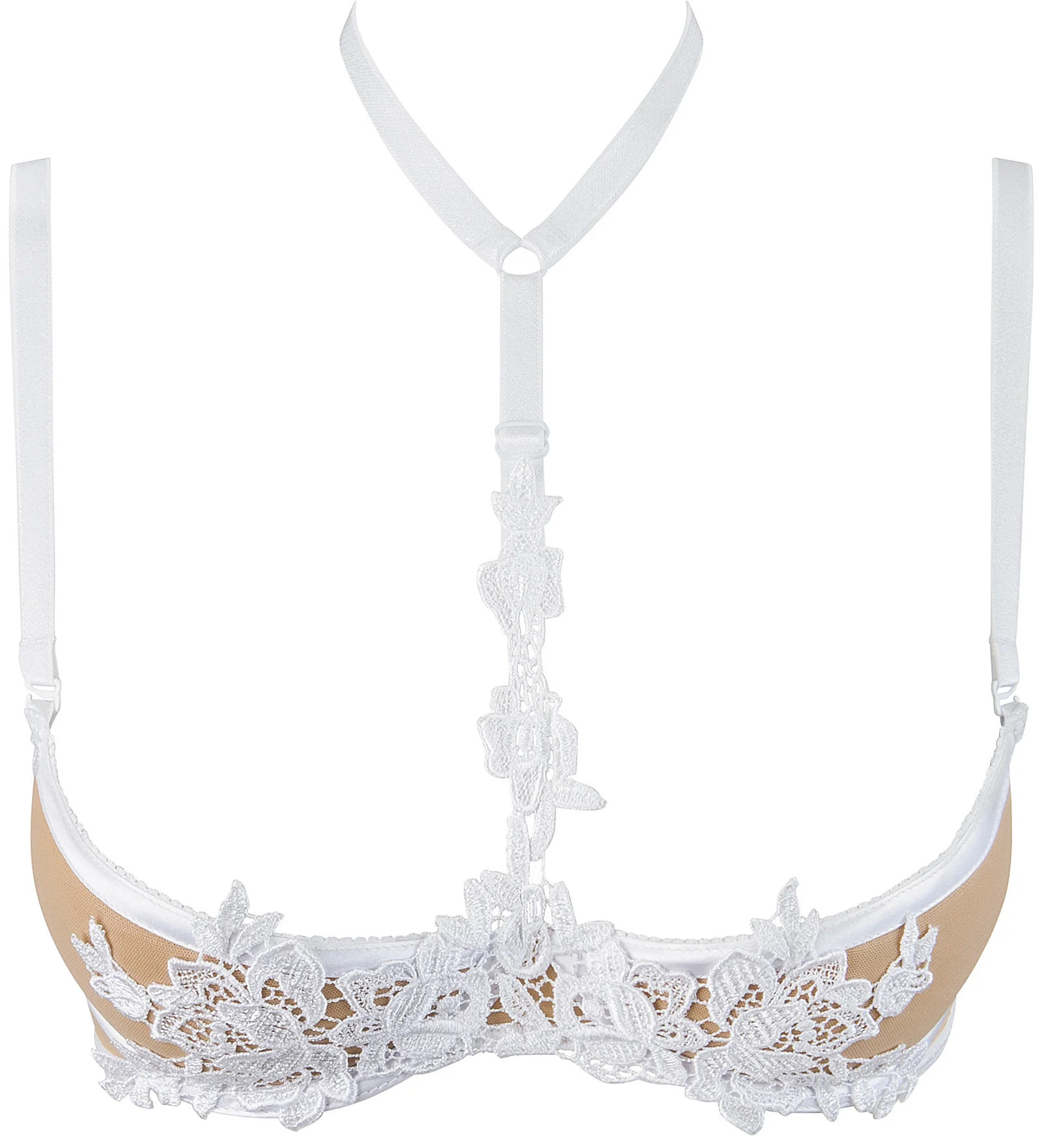 Push Up podprsenka peek-a-boo s otevřenými košíčky v kombinaci s chokerem je odvážnou kombinací prvků, která dodává neobvyklý smyslný půvab. Funkce Push Up zvýrazní vaše ňadra a dodá vám mimořádnou svůdnou sílu a neodolatelný půvab, Jemnost konstrukce soupravy dává vyniknout tomu nejlepšímu a výšivka zdobí jako šperk nebo smyslné tetování. Obsahuje tanga v-9648 a negližé v-8850. Zapínání je na nenápadný dvouřadý háček se smyčkou.