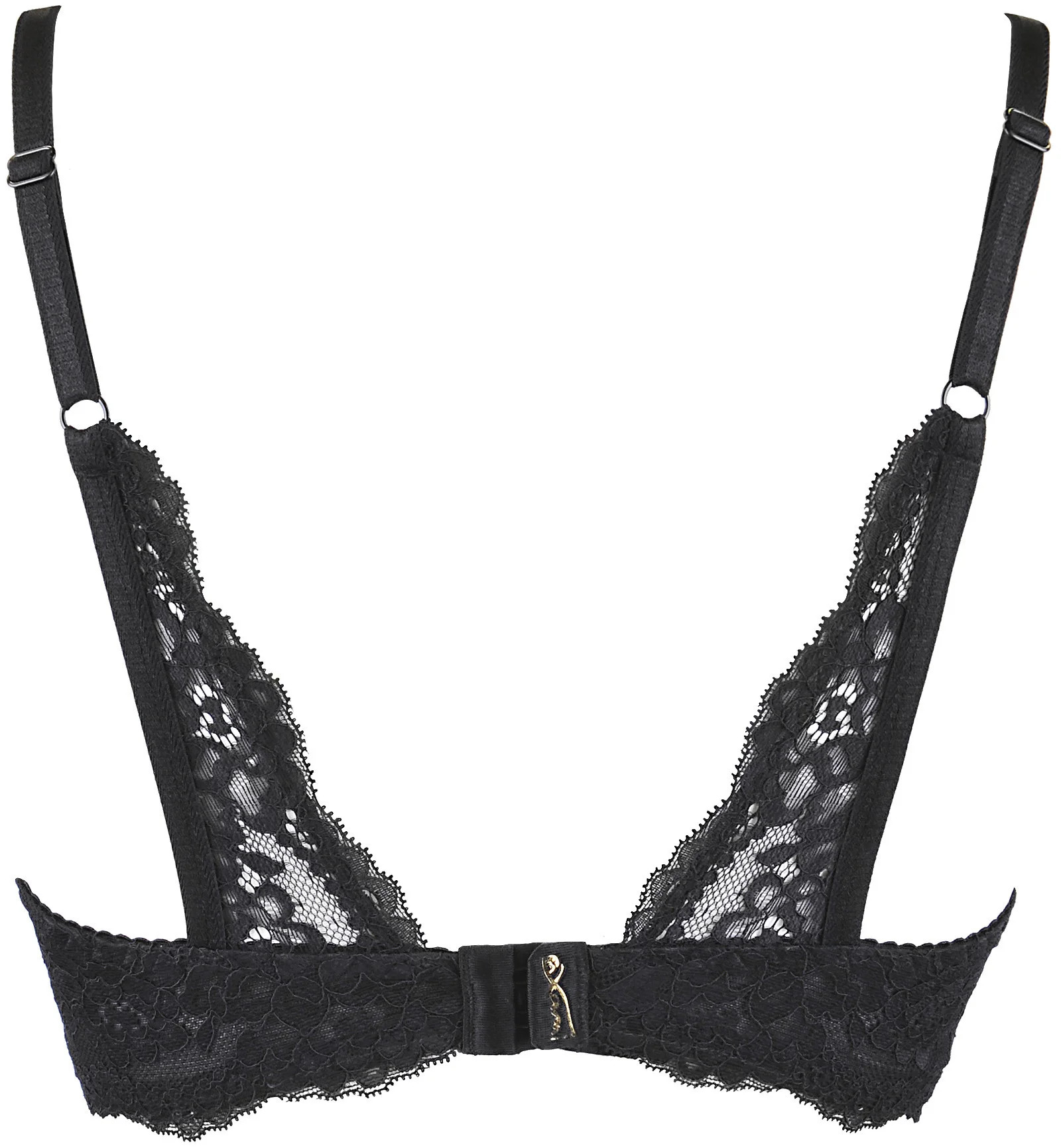 Ohromující a svůdná černá podprsenka V-9801 peek-a-boo upoutá pozornost strukturou látky - jemnou krajkou s příjemným povrchem a neodolatelnou mašlí mezi košíčky. Ramínka jsou nastavitelná, ale neodnímatelná, zapínání na dva háčky. Na zadní straně je krajková ozdoba ve tvaru křídel. K doplnění sady doporučujeme tanga V-9818. Žádné boční kostice, žádné výplně košíčků.