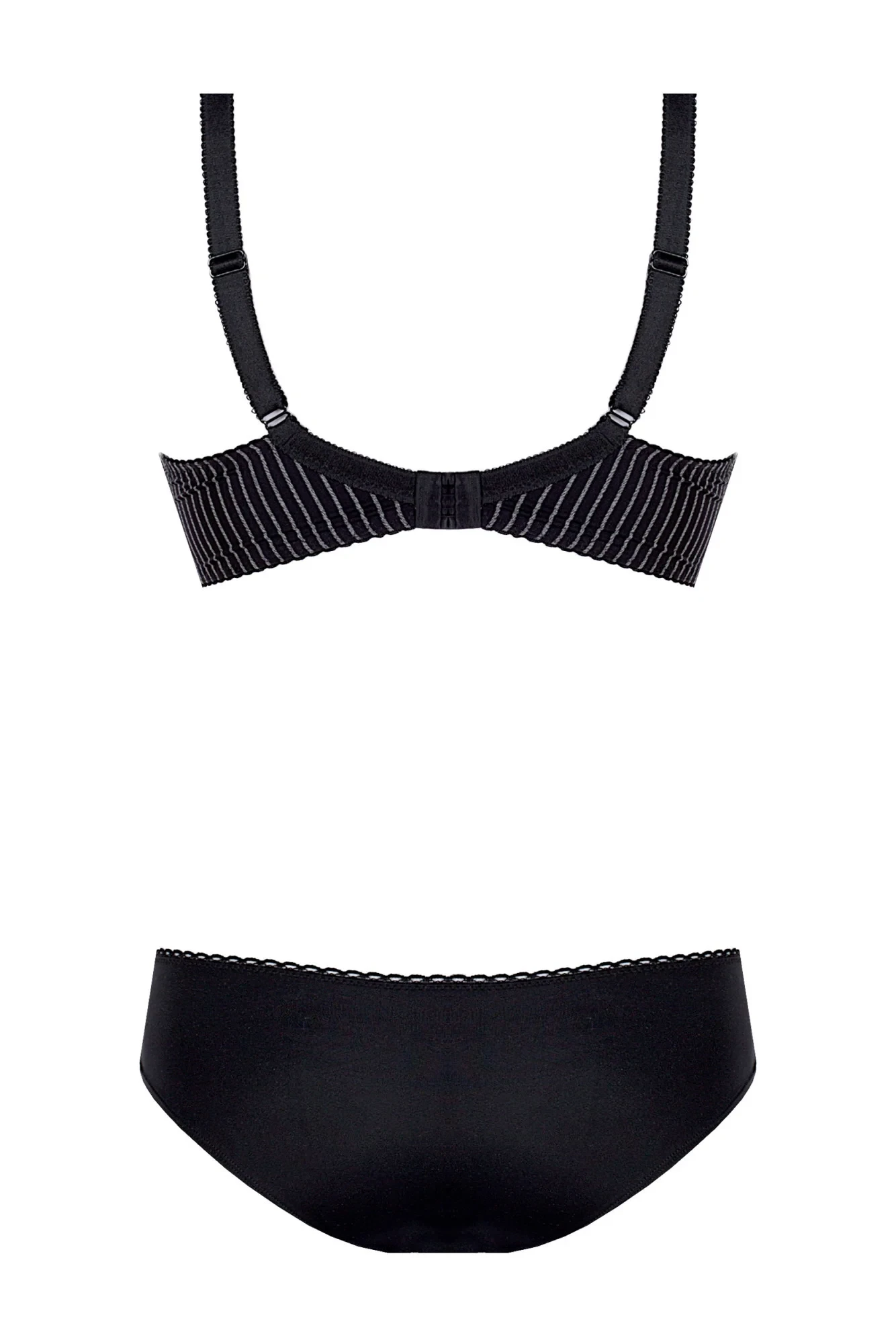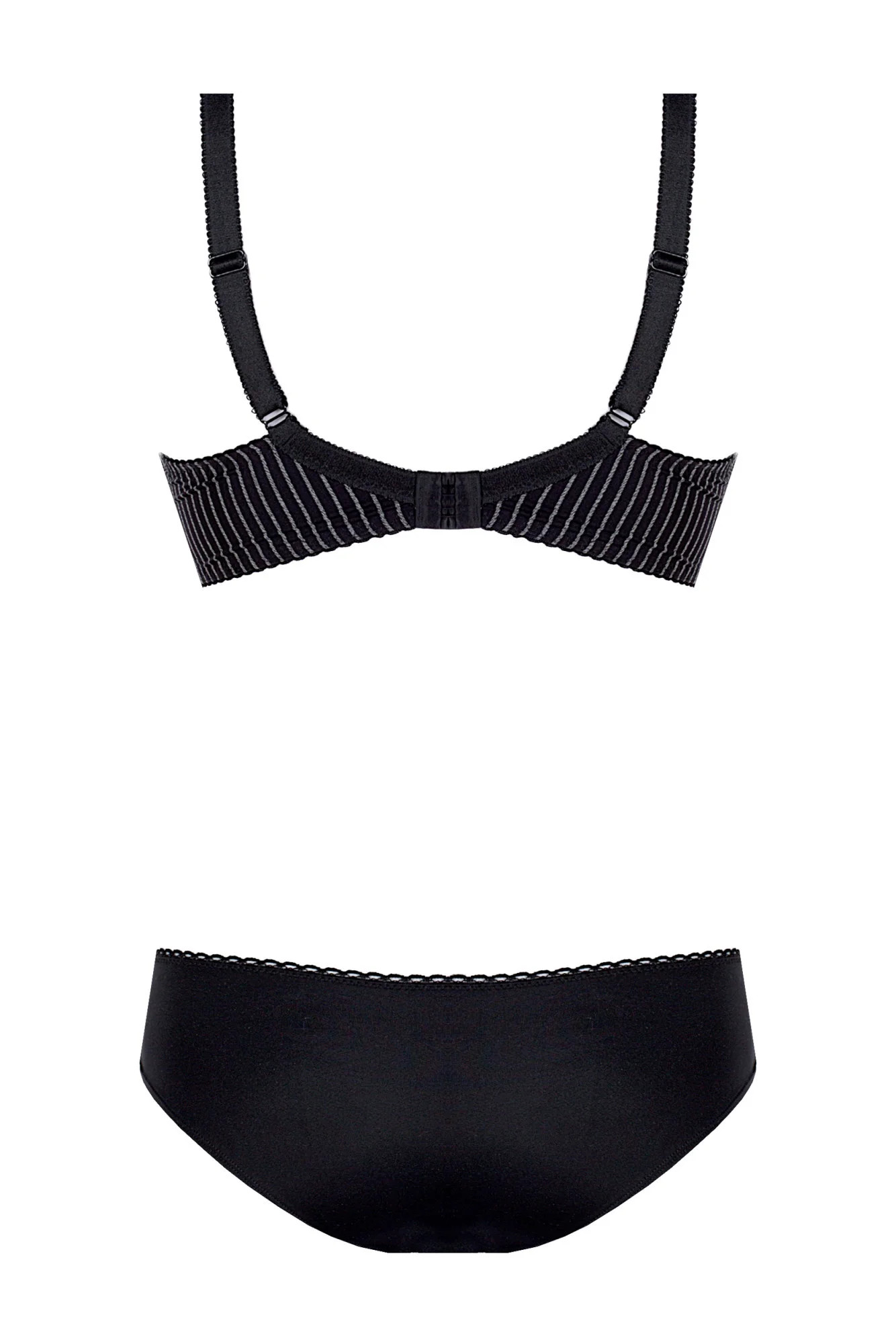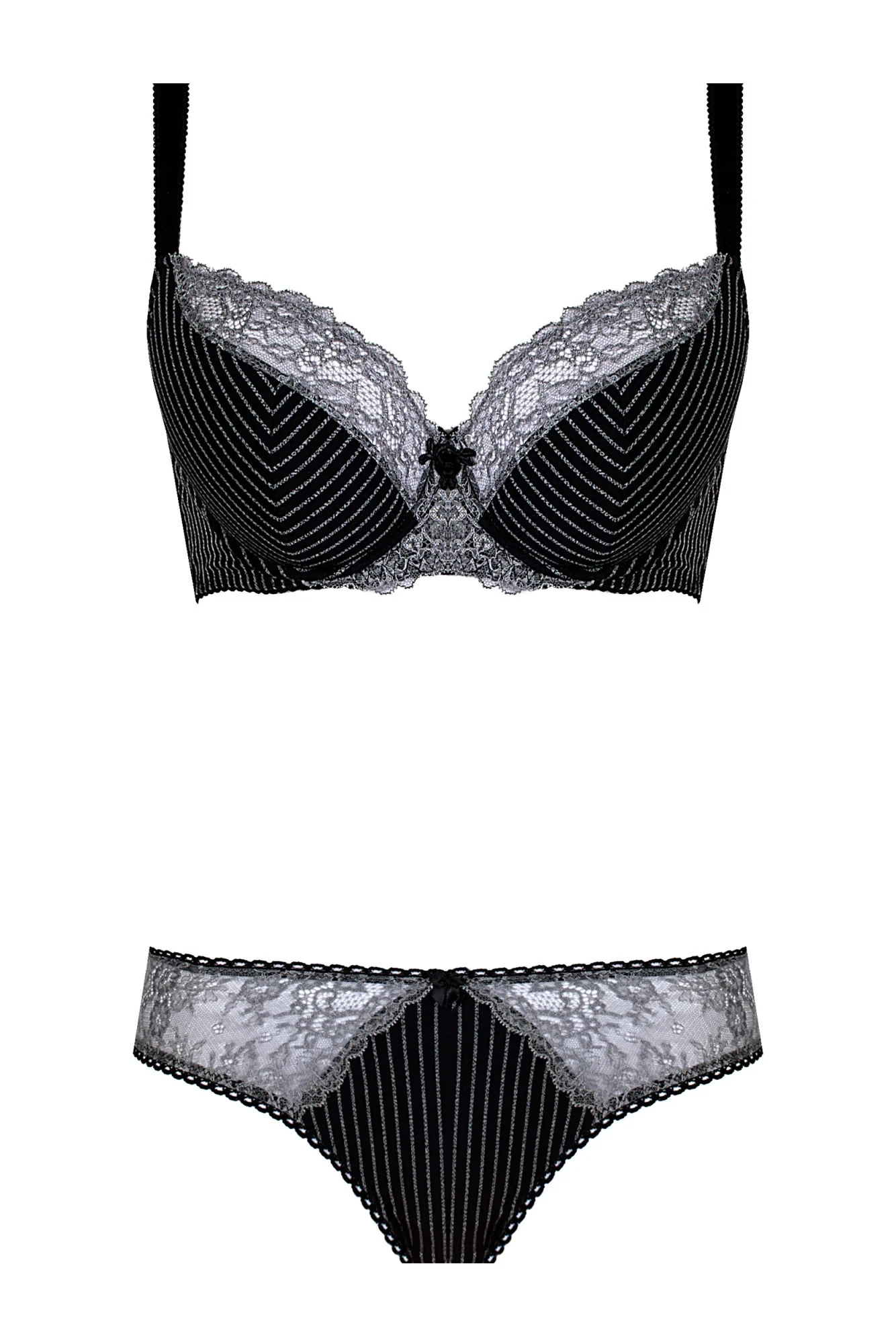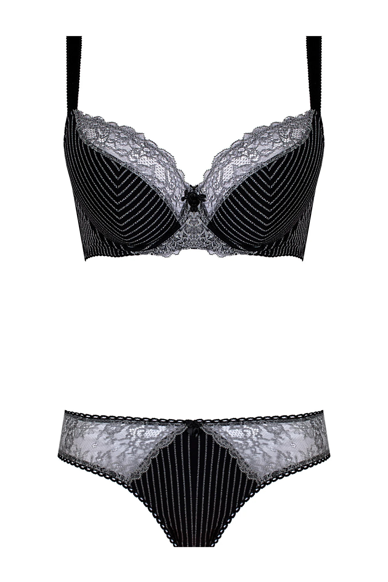 Vydejte se na výlet za elegancí. Toto spodní prádlo je poklonou tmavším barvám a vkusným doplňkům. Jemný pruhovaný potisk se zde snoubí s krajkovým lemem ve výstřihu. Šedo-olovnatý odstín působí tajemně. Košíčky s kosticemi, dobře vybírané a zvedající prsa, vytvářejí smyslný dekolt (polovyztužený střih - skvělý pro větší poprsí). Nastavitelná ramínka. Ideální pro podzimně-zimní sezónu.
