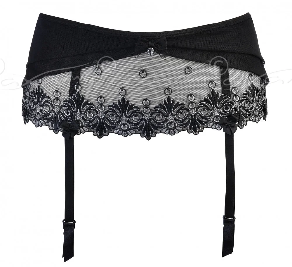 velmi zajímavý podvazkový pás Bell V-5132 vás jistě zaujme. Pod kvalitním černým tylem se objevuje průhledná krajková spodní část, která se třpytí stříbrem.