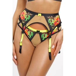 Dodejte svému spodnímu prádlu nádech neonového šmrncu a elegance s podvazkovým pásem V-11832. Vyrobený z barevné neonové výšivky přitahuje pozornost a skvěle doplňuje odpovídající podprsenku. Kontrastní černé a žluté pruhy vytvářejí odvážný, moderní akcent, zatímco jemný béžový tyl měkce obepíná siluetu pro pohodlí a jemnost. Pás, který je spojením odvahy, stylu a smyslné lehkosti.