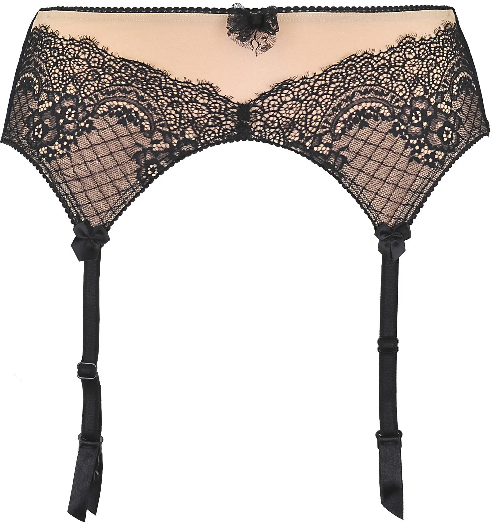 Svůdný a okouzlující podvazkový pás v opálené béžové barvě, zdobený rafinovanou, černou krajkou. Zdůrazňuje pas a křivky boků, v zadní části je vyroben z průsvitného tylu, okraje zakončené ozdobnou stuhou s očky. Pás se zapíná na dvojitý háček. Materiálové složení: polyamid 83 %, elastan 17 %