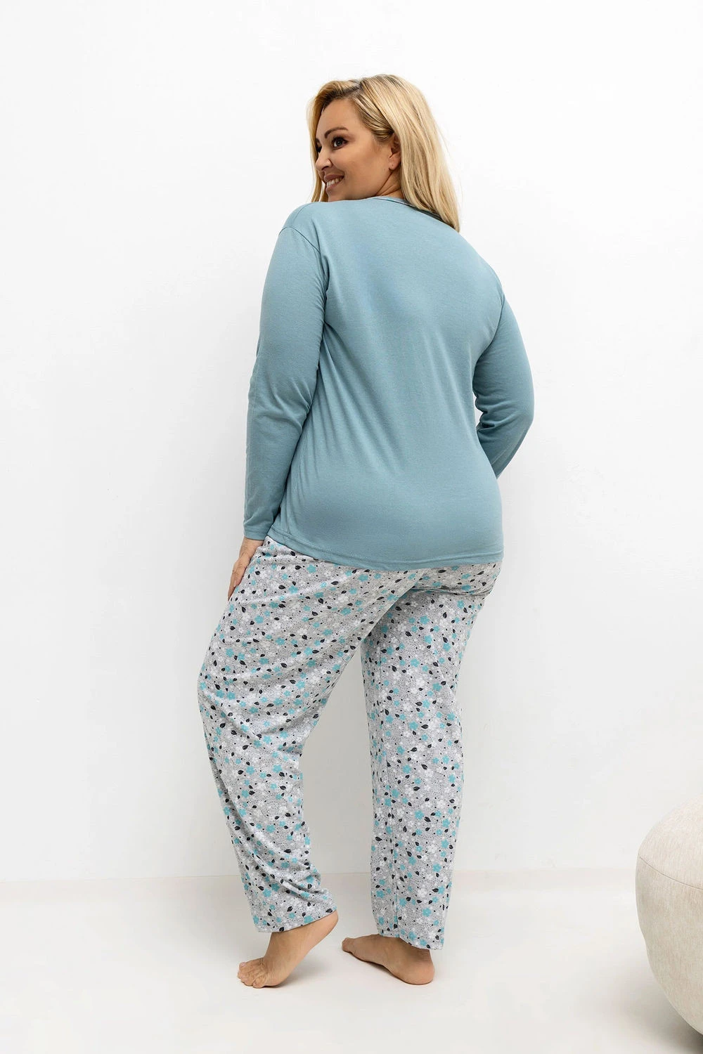 Dámský pyžamový set plus size vytvořený s ohledem na pohodlí a styl. Vyrobený z převažující bavlny, zajišťuje prodyšnost, měkkost a ideální přizpůsobení pro noční odpočinek. Horní část tvoří tričko s kulatým výstřihem a dlouhými rukávy, zdobené praktickou lištou se třemi knoflíky vpředu, která celku dodává jemný ženský akcent. Dlouhé kalhoty zdobí převažující květinový potisk, který pyžamu dodává svěžest a jemný šarm. Střih plus size zaručuje pohodlné nošení a volnost pohybů, což z něj činí skvělý komplet jak pro spaní, tak večerní relaxaci.