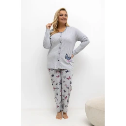 Pyžamo pro dámy ve velikosti plus je stylový a pohodlný set skládající se z košile a kalhot. Horní část má kulatý výstřih, dlouhý rukáv a je celkově zapínána na knoflíky, co zajišťuje pohodlí a klasický vzhled. Na přední části košile je jemný potisk motýlků, který dodává celku jemný ženský šarm. Kalhoty s dlouhými přímými nohavicemi se vyznačují dominantním potiskem s motýly a puntíky, vytvářející atraktivní a harmonický vzor. Volný střih zaručuje plnou volnost pohybu a pohodlí po celou noc. Je to ideální volba pro ženy ve velikosti plus, které ocení kombinaci pohodlí, jemných vzorů a praktického střihu.