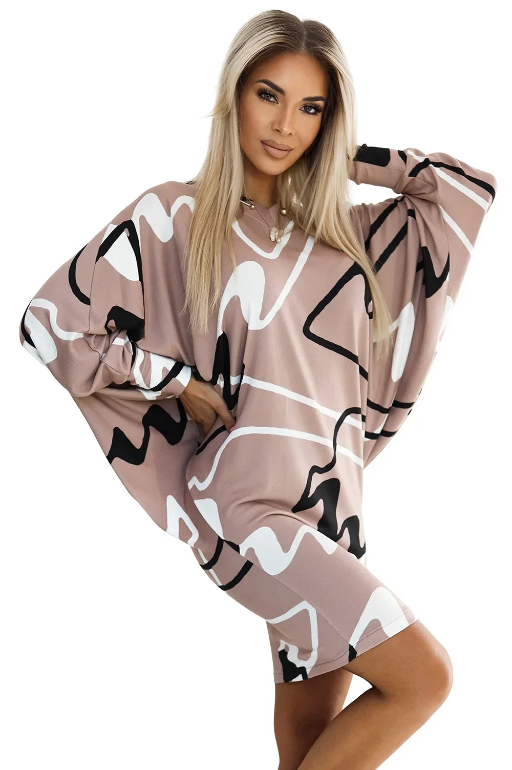 Pohodlné béžové dámské netopýří šaty s výstřihem a s vzorem model 20647184 - numoco