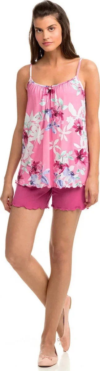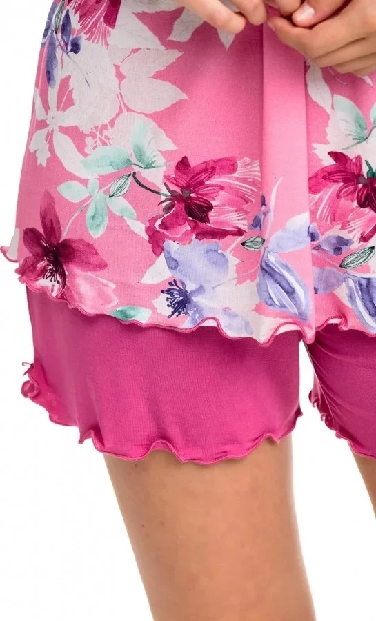 Dvoudílné dámské pyžamo pro pohodlné spaní. Komplet sestává z elegantní košilky s volánky na lemu, kterou doplňují krátké šortky. Set je vyroben z vysoce kvalitního Micro-modalu s příměsí Elastanu. Přírodní Micro-modal poskytuje vyjímečnou měkkost, lehkost a pohodlí, je prodyšný, při praní se nesráží, dobře absorbuje pot a rychle schne, zatímco Elastan dodává oděvu potřebnou pružnost.